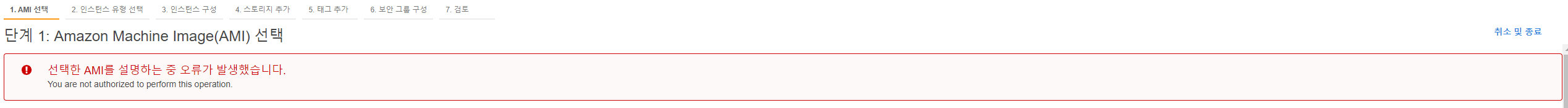 - 그러면 콘솔 상단에 아래와 같이 권한이 없다는 에러 메세지가 나오며 EC2 생성을 할 수 없도록 권한제한이 되었다는 것을 알 수 있다.